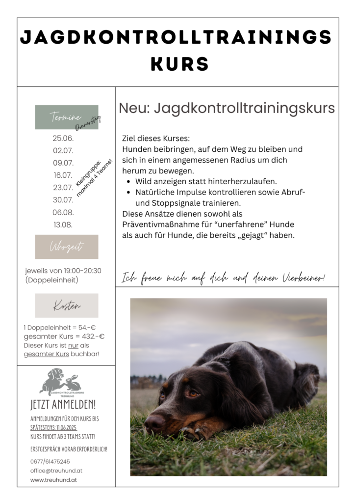 Kontakt & Terminvereinbarung: Wenn du Interesse hast, besprechen wir alle Details in einem persönlichen Vorgespräch. Das Vorgespräch für den Jagdkontrollkurs kann entweder am Hundsgut oder online (via Zoom oder Teams) stattfinden. Melde dich einfach, um einen Termin zu vereinbaren unter: Kontakt – Treuhund oder schreibe mir eine Mail unter: office@treuhund.at