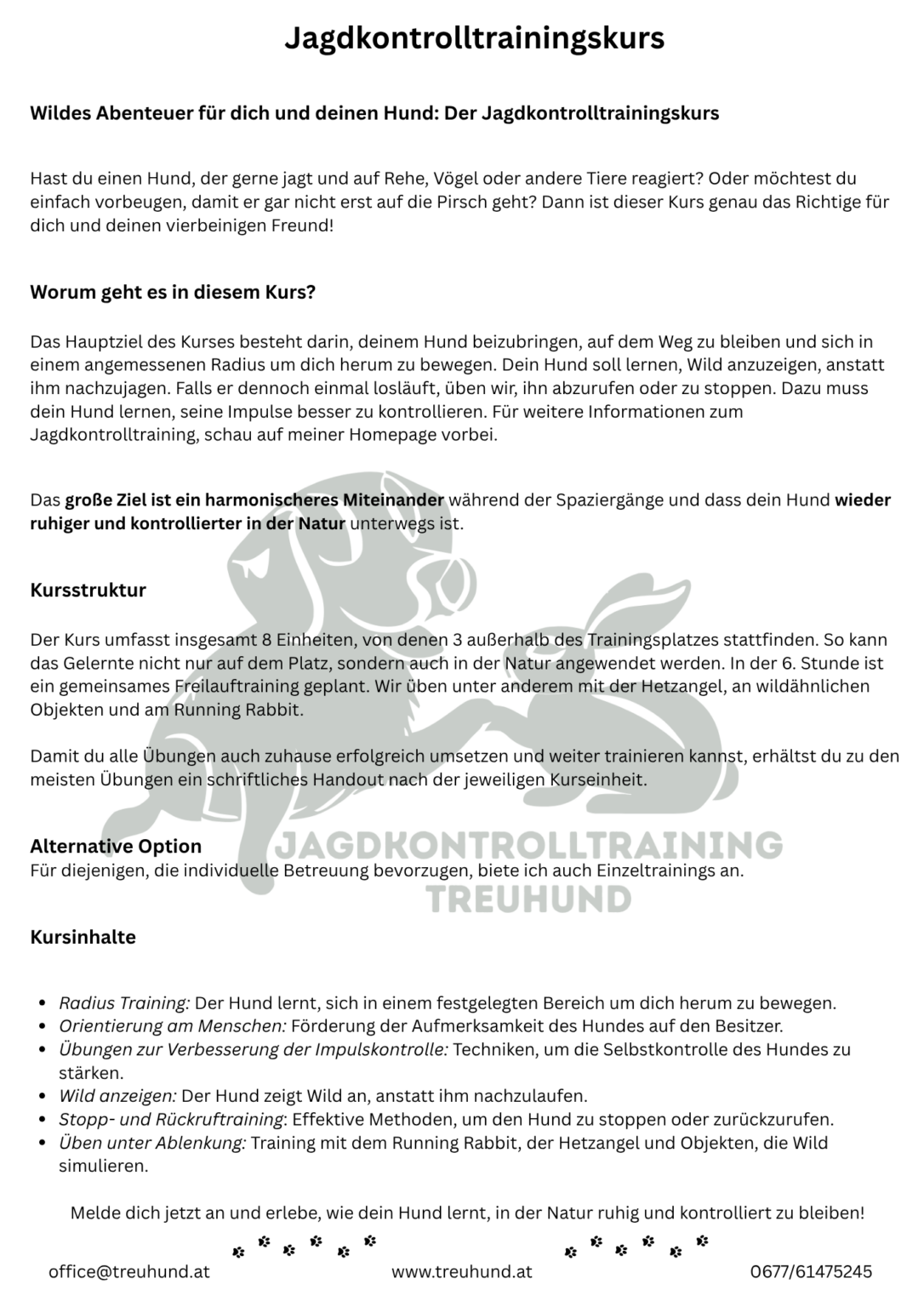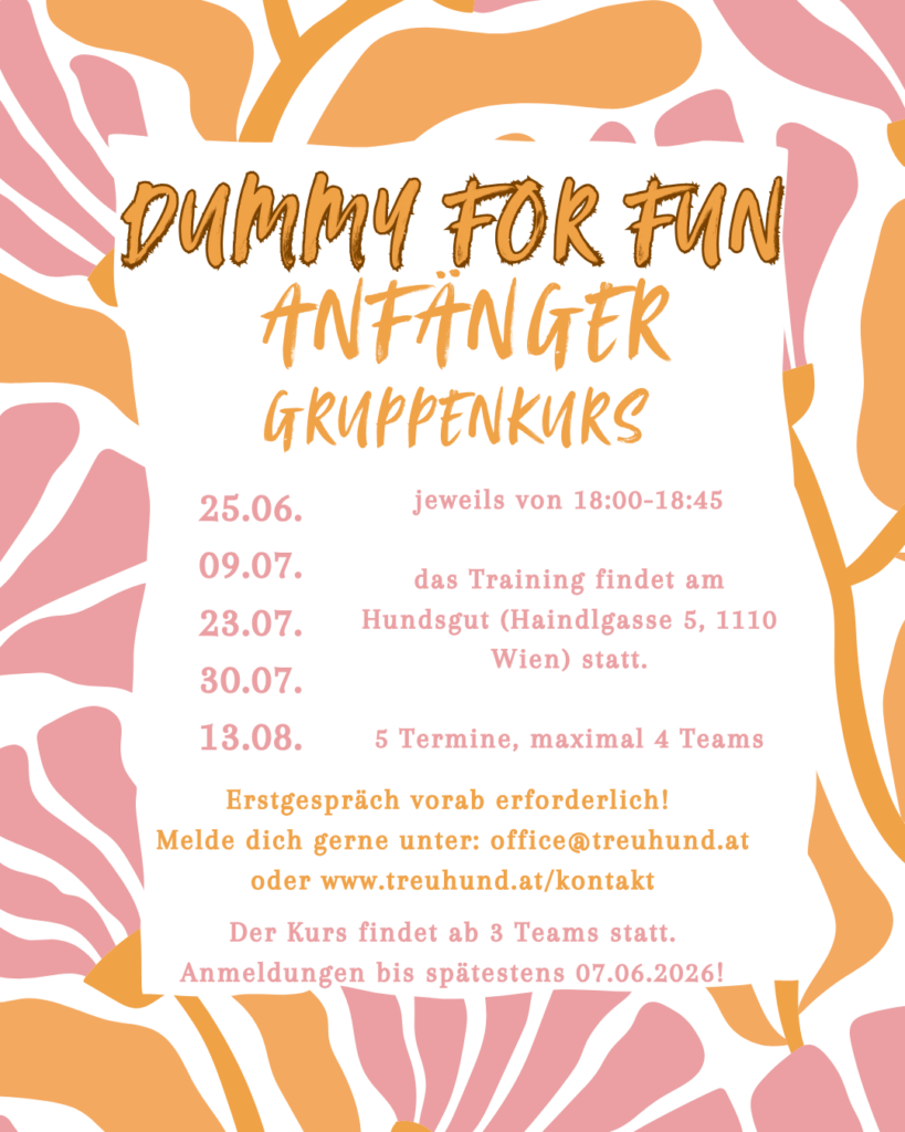 Ein Erstgespräch ist vorab erforderlich. Kontaktiere mich gerne hier auf meiner Homepage unter „Kontakt“ oder melde dich einfach per Mail unter: office@treuhund.at